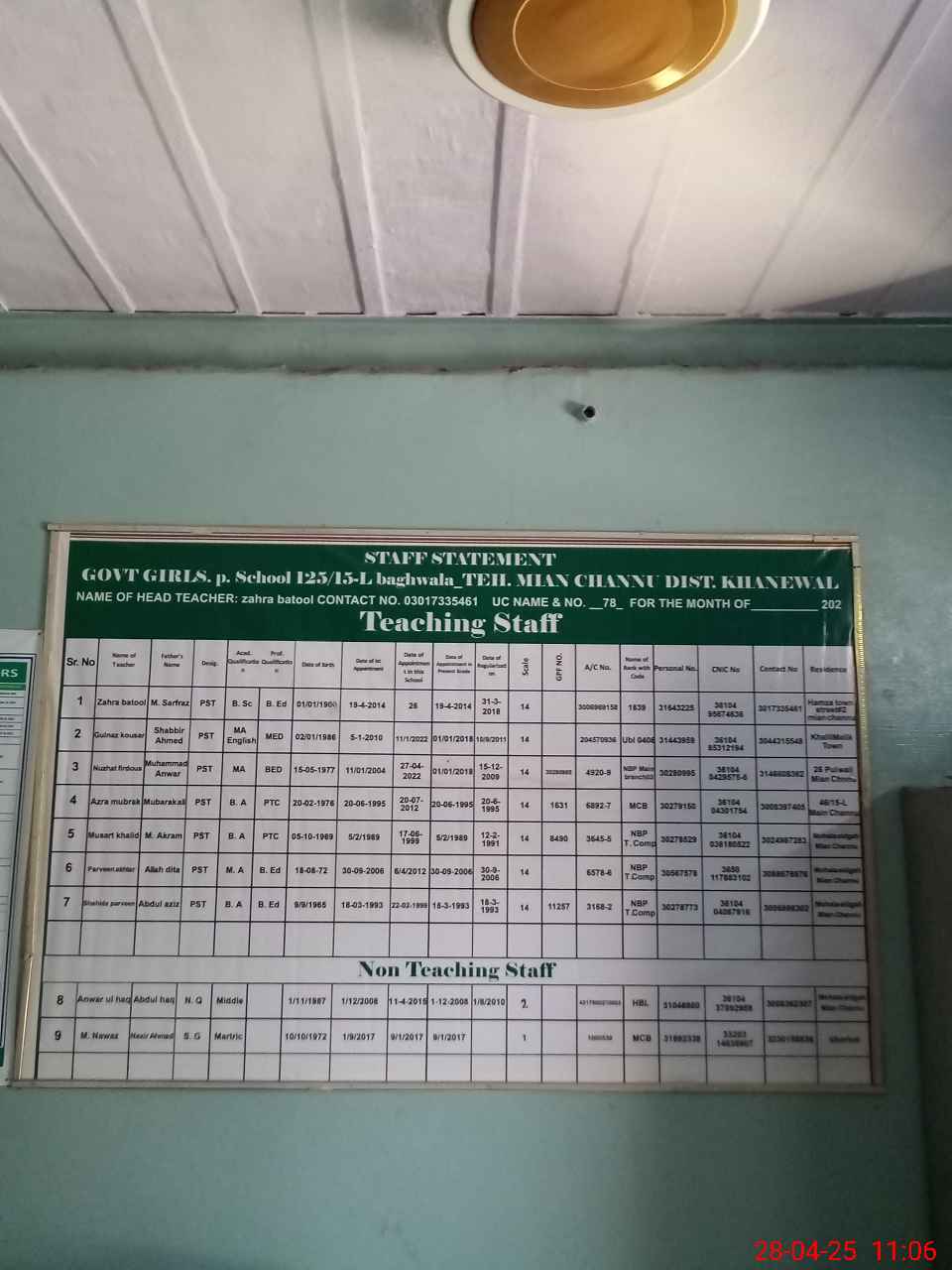 | EMIS Code: 36430325 | Name of School: GGPS 125/15-L BAGH WALA, MIAN CHANNU | |||