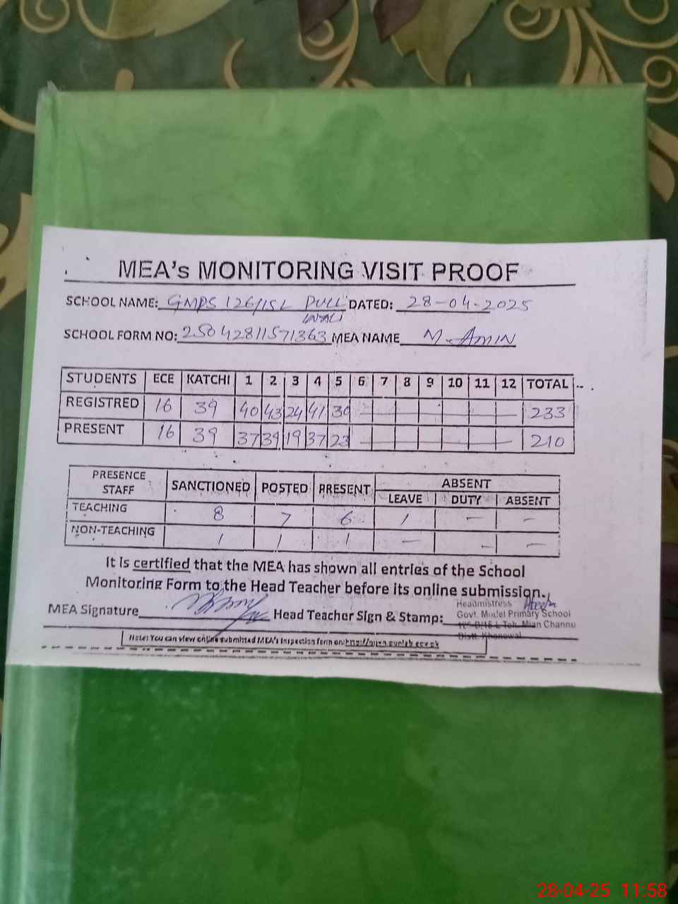 | Attendance Register | Head Teacher | MEA with School | Visit Proof |