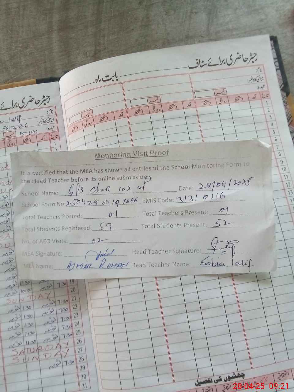 | EMIS Code: 31310116 | Name of School: GPS CHAK 102/NP | |||