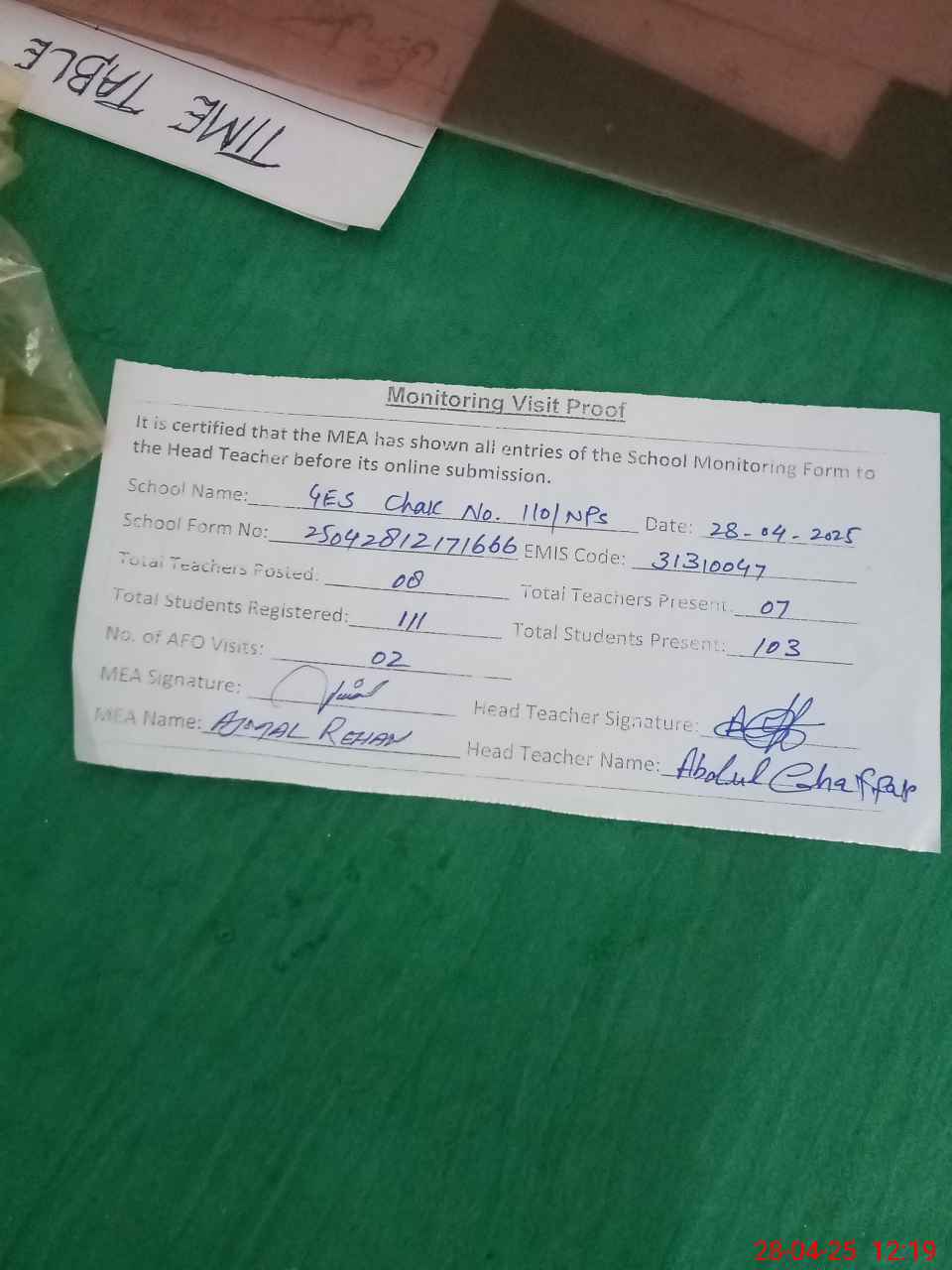 | Attendance Register | Head Teacher | MEA with School | Visit Proof |