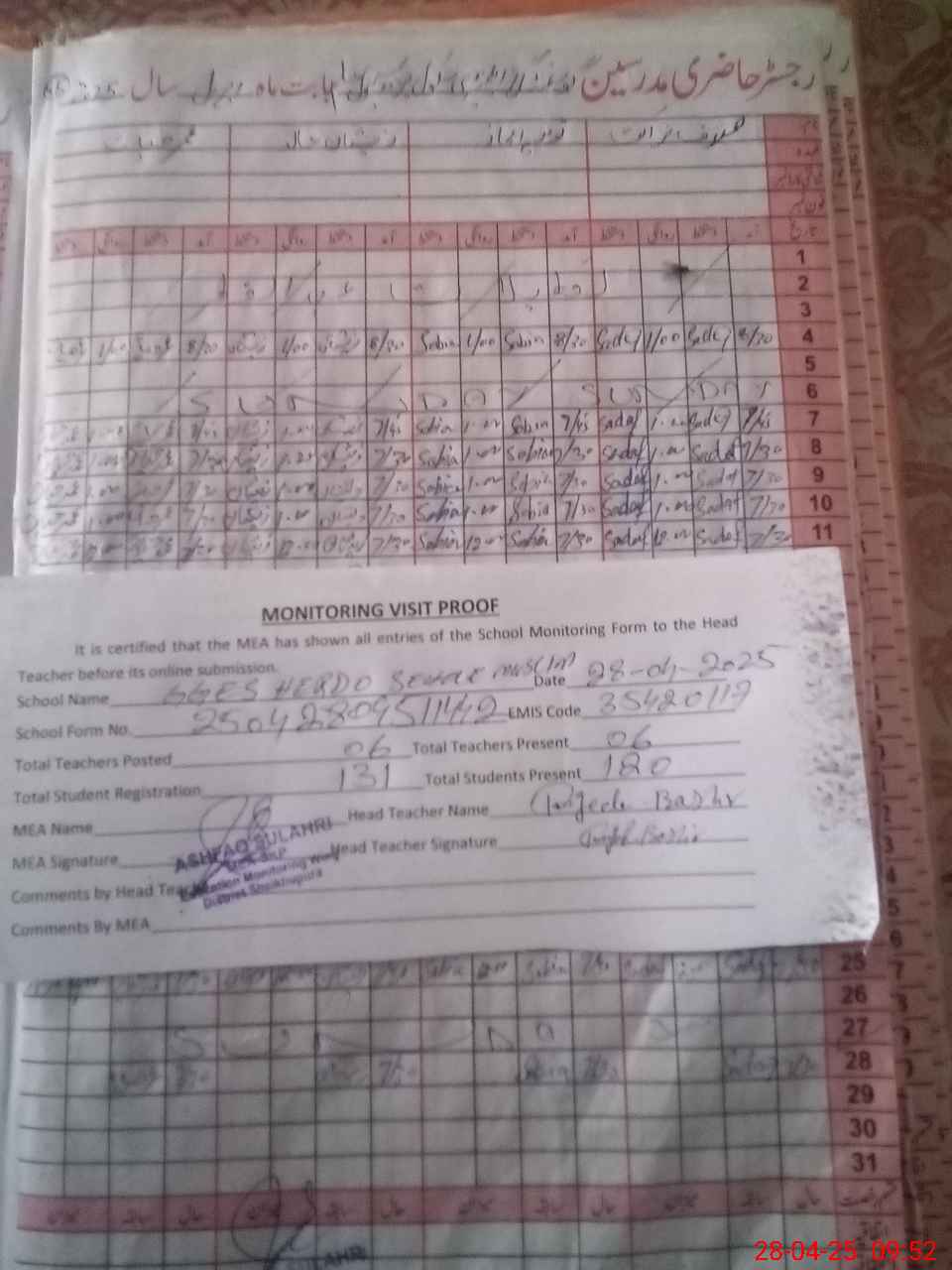 | Attendance Register | Head Teacher | MEA with School | Visit Proof |