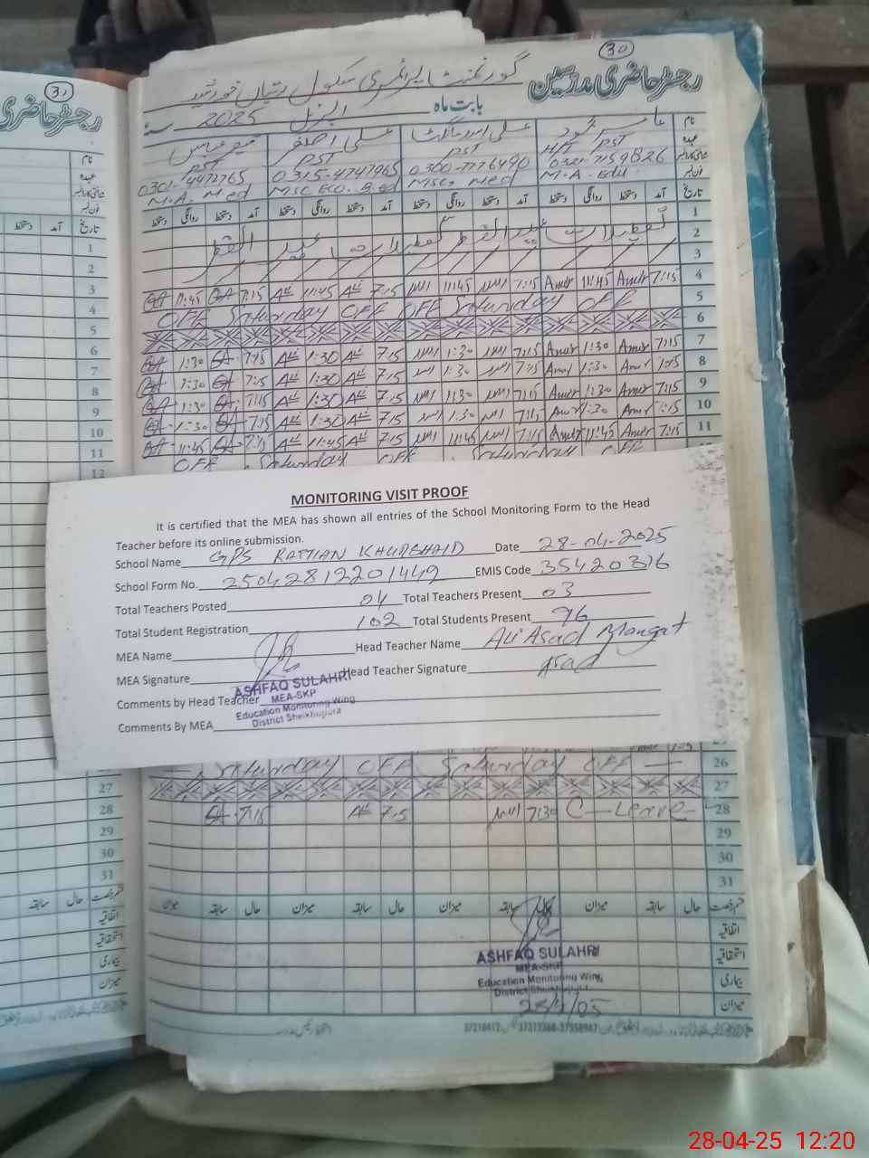 | Attendance Register | Head Teacher | MEA with School | Visit Proof |