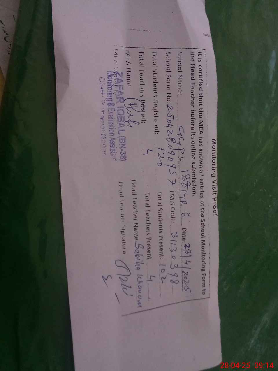 | Attendance Register | Head Teacher | MEA with School | Visit Proof |
