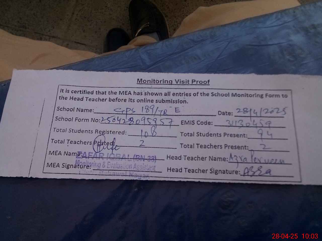| Attendance Register | Head Teacher | MEA with School | Visit Proof |