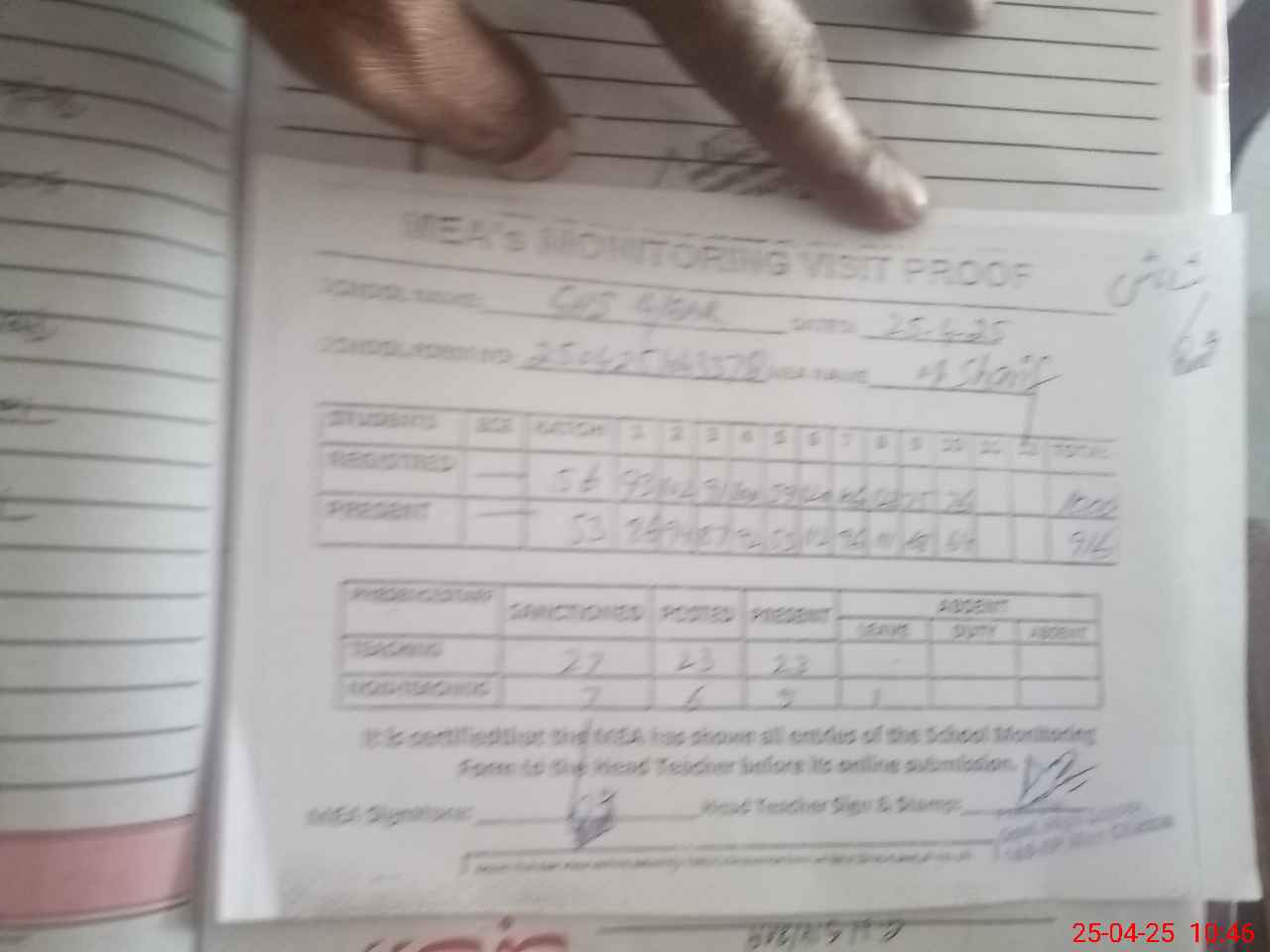 | Attendance Register | Head Teacher | MEA with School | Visit Proof |