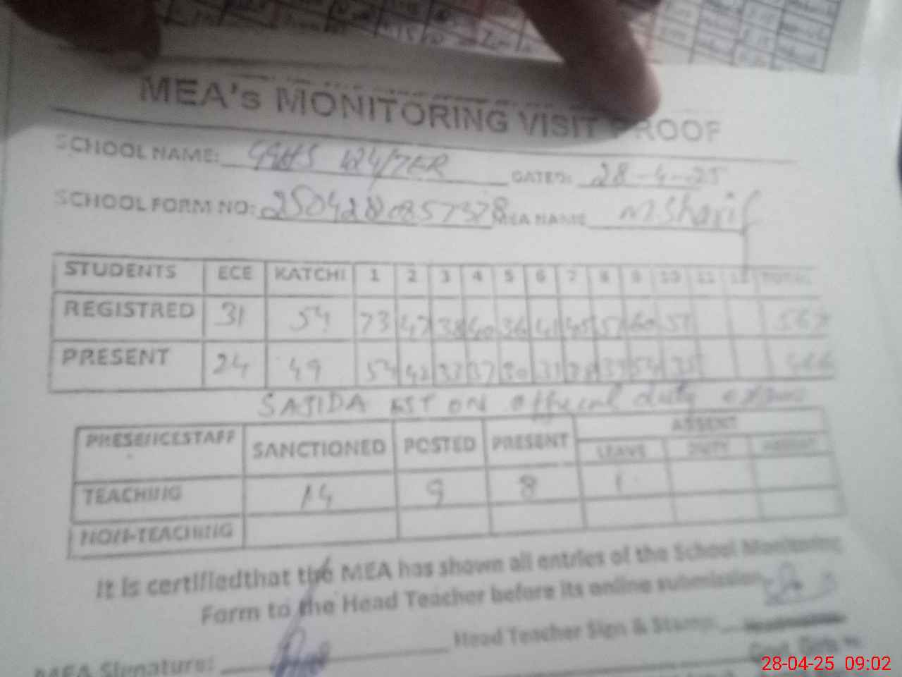 | Attendance Register | Head Teacher | MEA with School | Visit Proof |