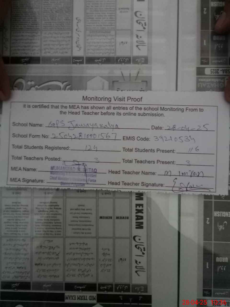 | Attendance Register | Head Teacher | MEA with School | Visit Proof |