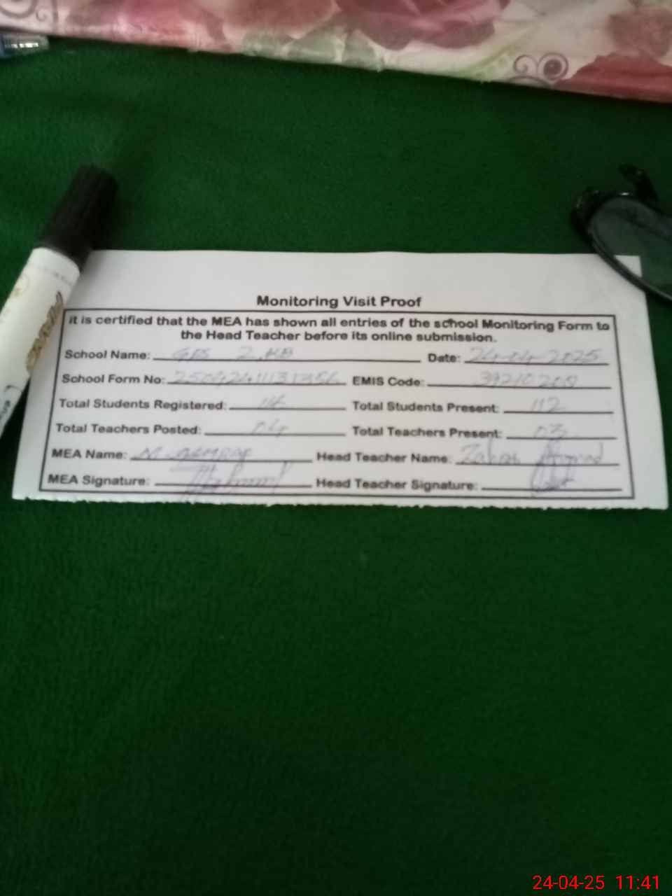| Attendance Register | Head Teacher | MEA with School | Visit Proof |