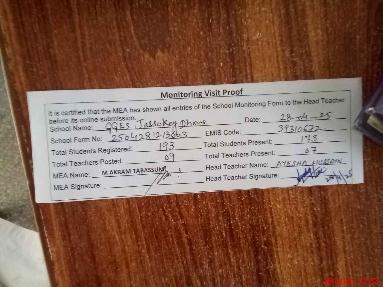 | Attendance Register | Head Teacher | MEA with School | Visit Proof |