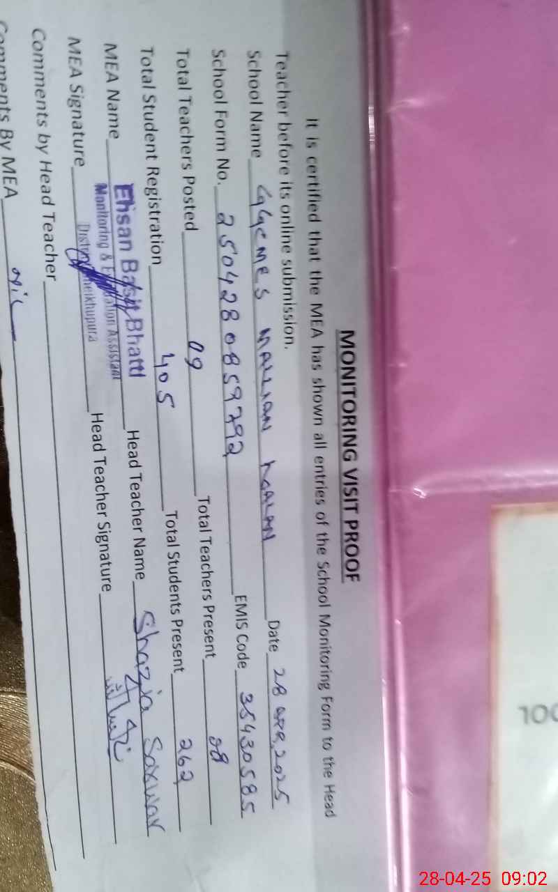 | Attendance Register | Head Teacher | MEA with School | Visit Proof |