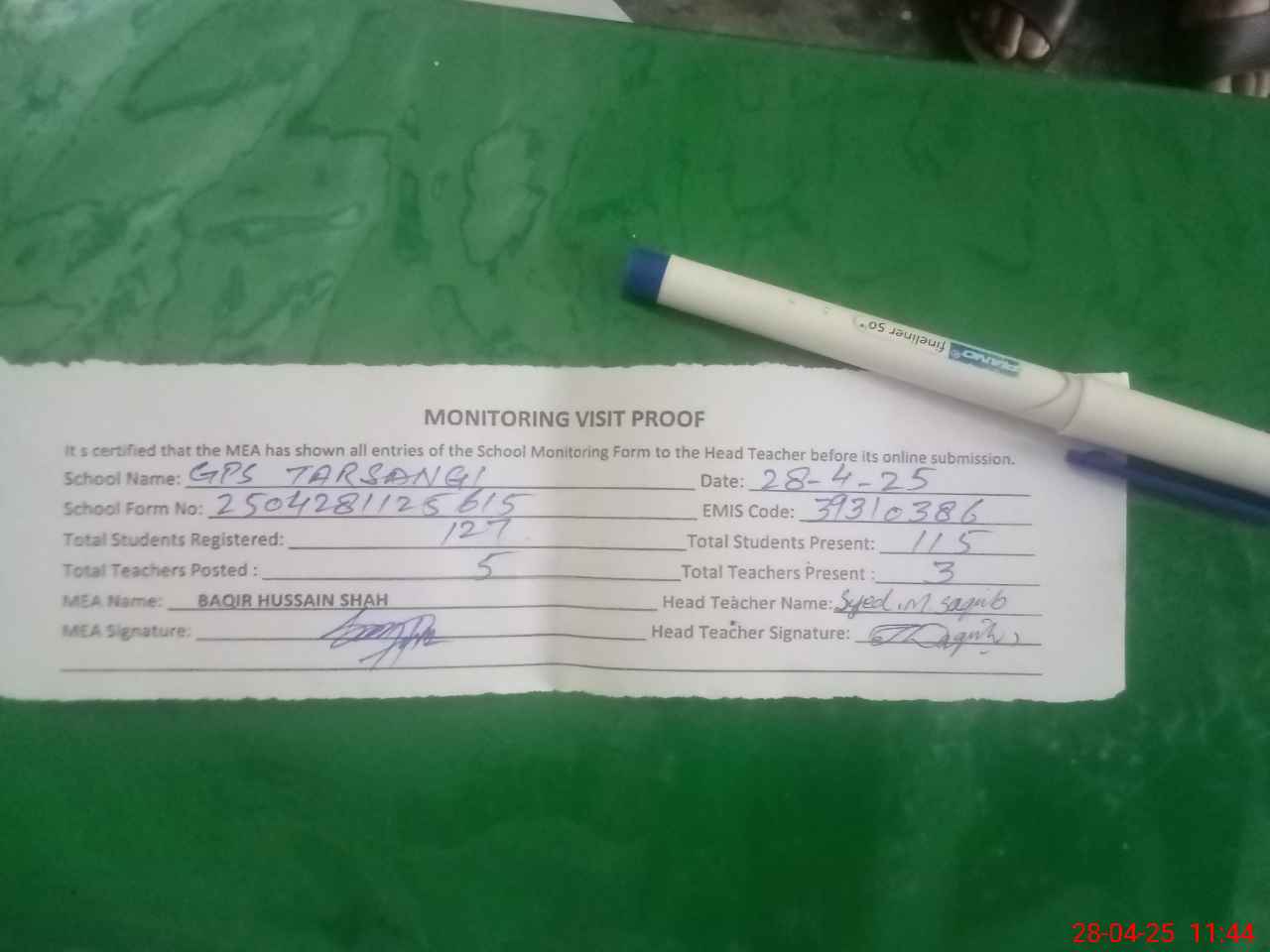 | Attendance Register | Head Teacher | MEA with School | Visit Proof |