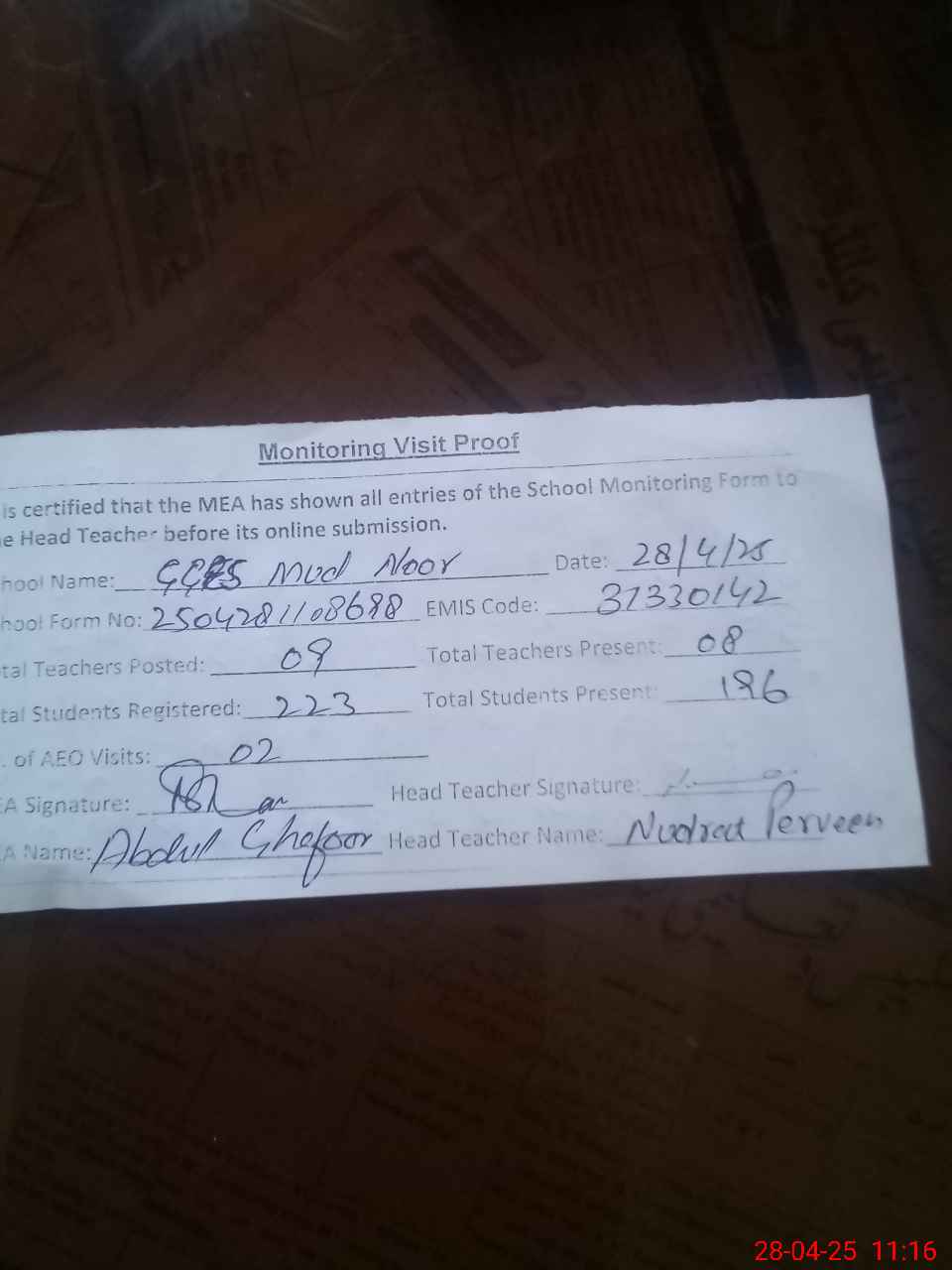 | Attendance Register | Head Teacher | MEA with School | Visit Proof |