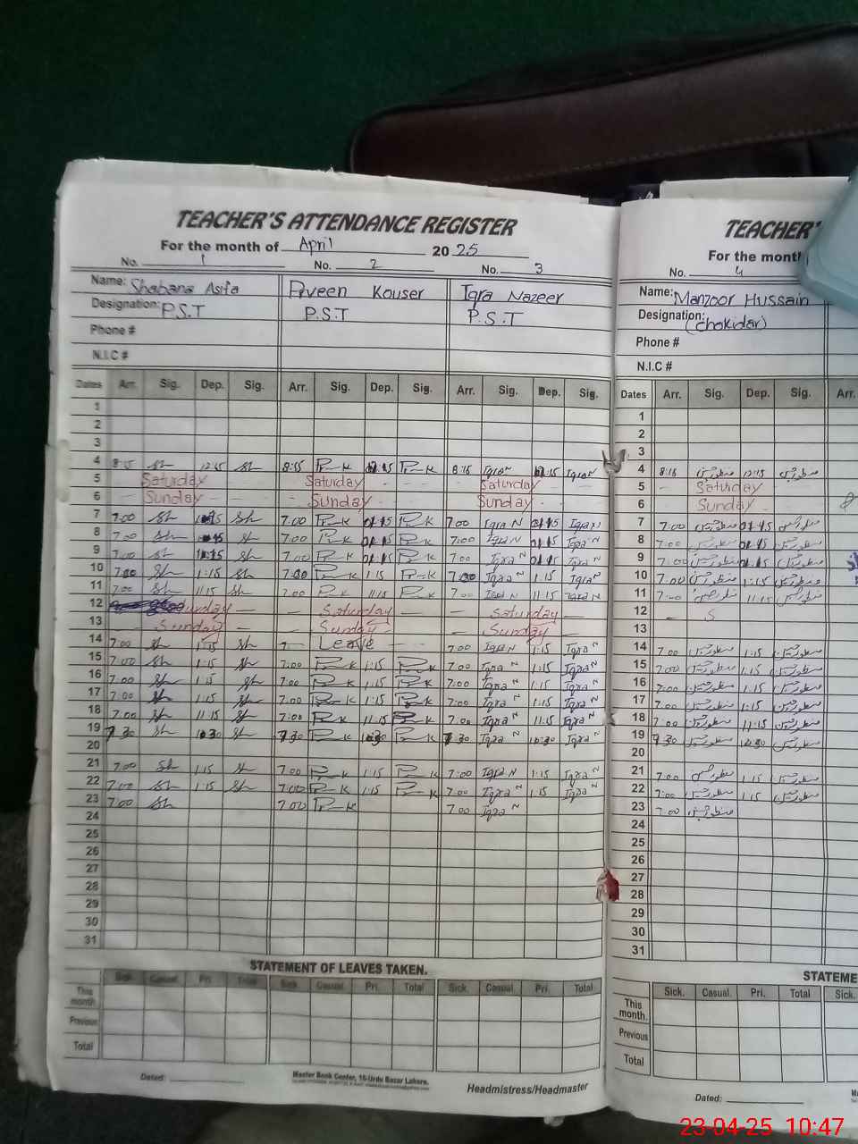 | Leave | Duty | Absent | Maternity | Medical | Ex- Pak |