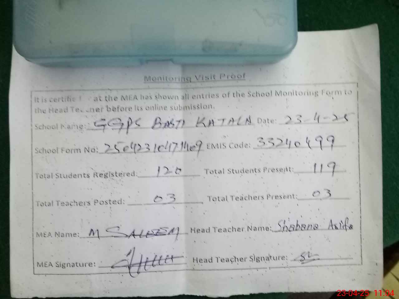 | Attendance Register | Head Teacher | MEA with School | Visit Proof |