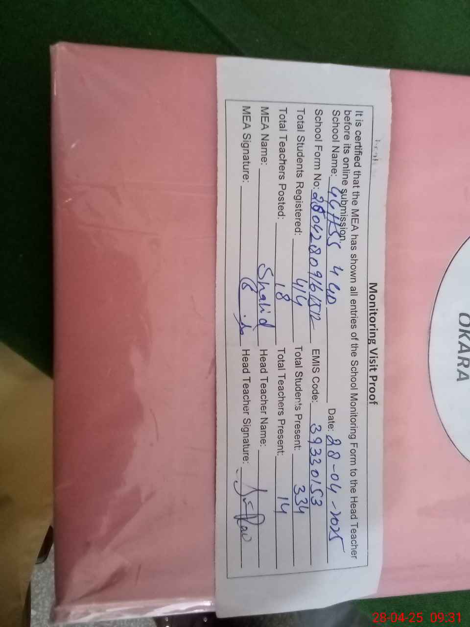 | Certified that this School was Inspected by the Undersigned MEA/DMO Today and the Information Stated Above is as Per Record. | |||||