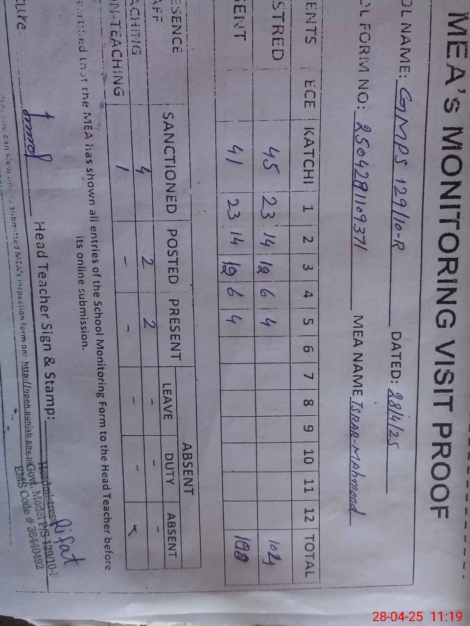 | EMIS Code: 36440492 | Name of School: GMPS 129/10-R, JAHANIAN | |||