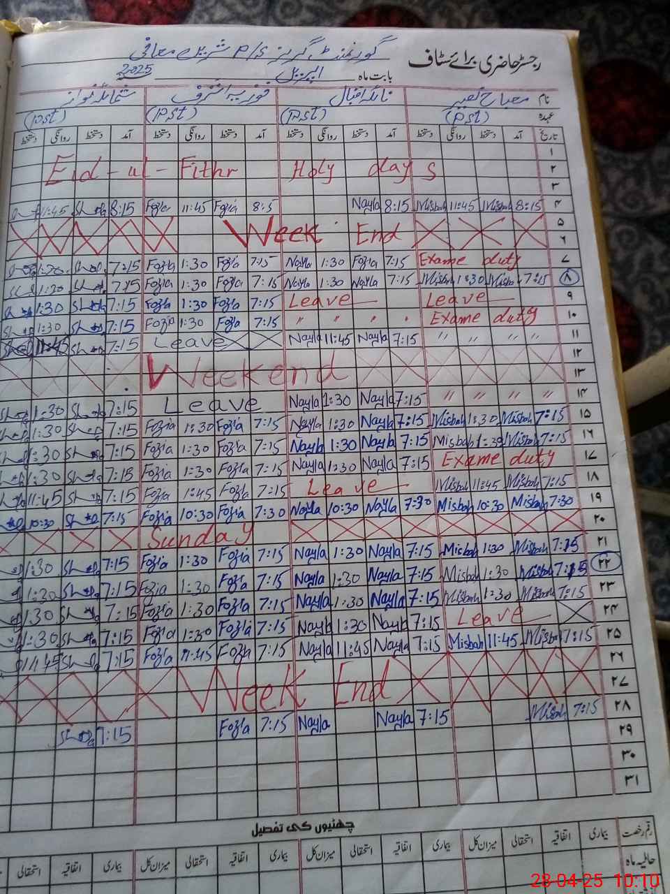 | Leave | Duty | Absent | Maternity | Medical | Ex- Pak |