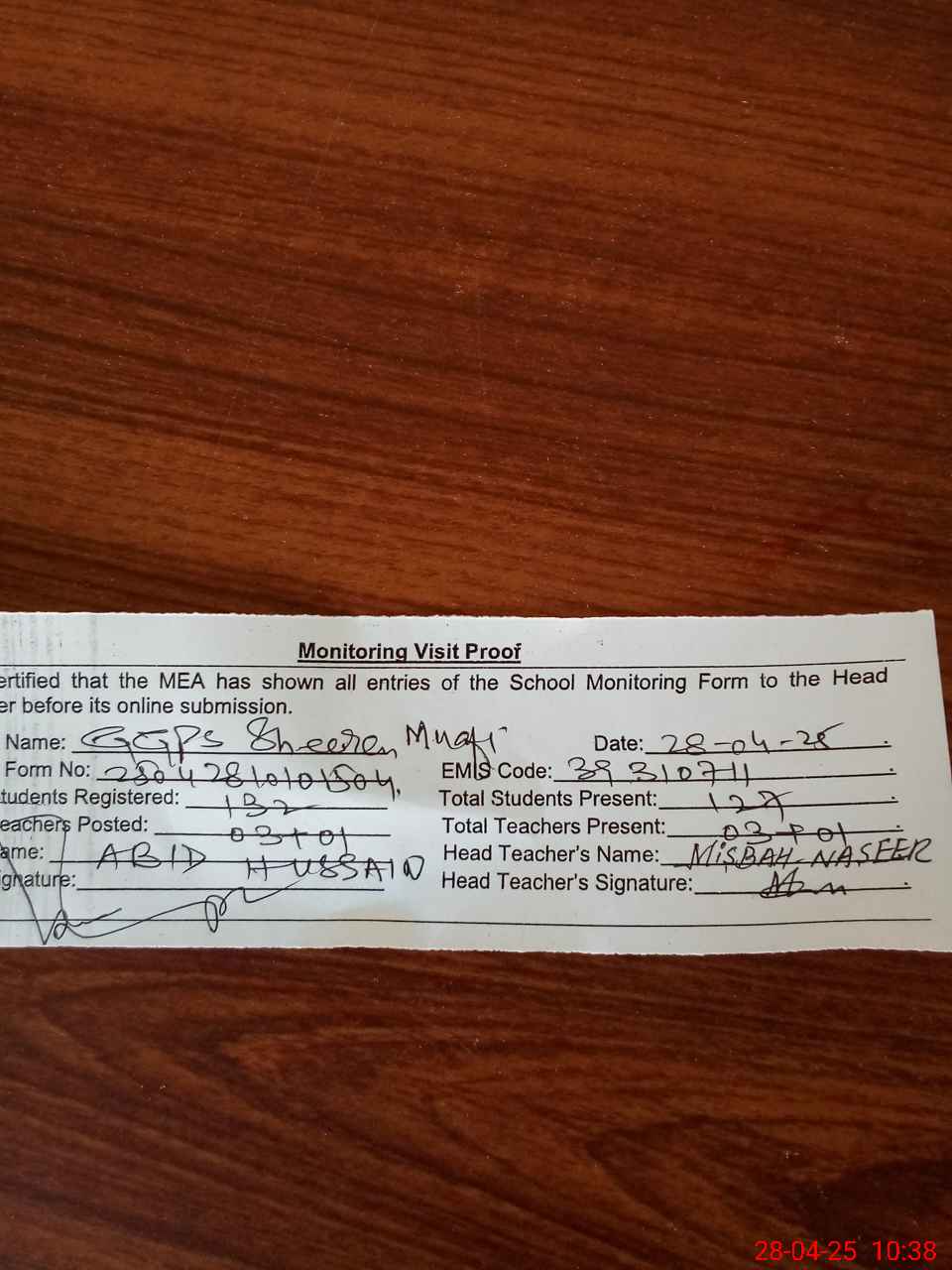 | Attendance Register | Head Teacher | MEA with School | Visit Proof |