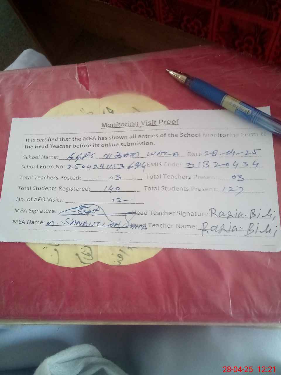 | Attendance Register | Head Teacher | MEA with School | Visit Proof |