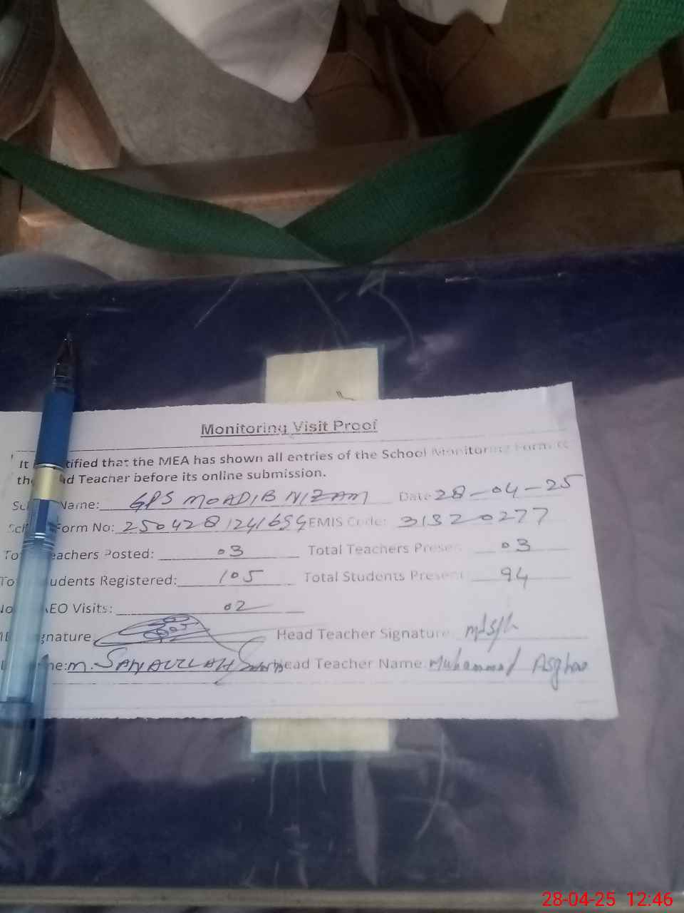 | Attendance Register | Head Teacher | MEA with School | Visit Proof |