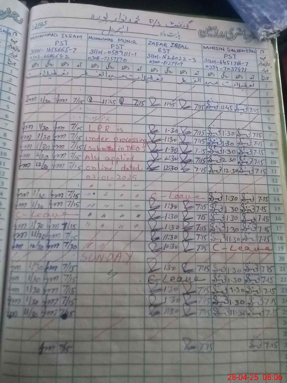 | CNIC | Full Name | Designation | R/C | Absence During Last Calender Month |