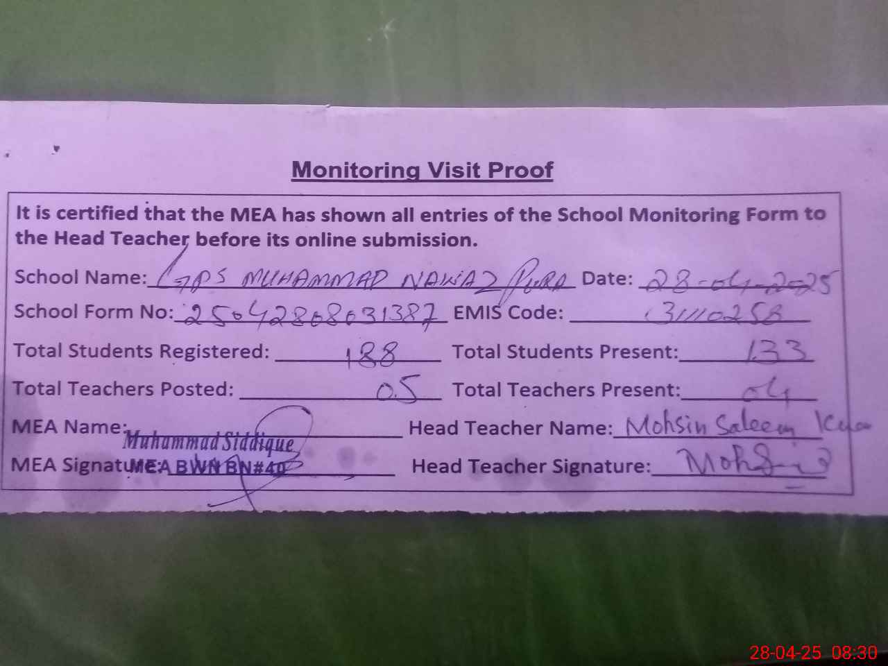 | Attendance Register | Head Teacher | MEA with School | Visit Proof |