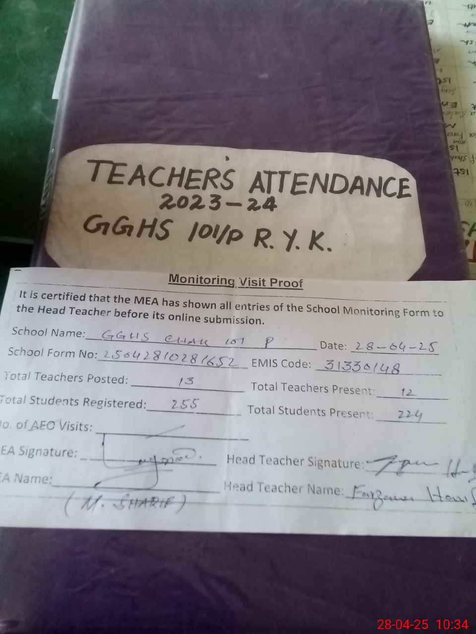 | EMIS Code: 31330148 | Name of School: GGHS CHAK NO. 101/P | |||