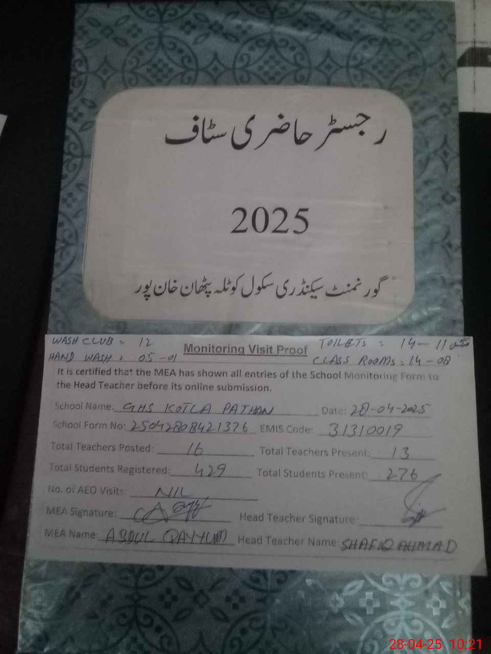 | Attendance Register | Head Teacher | MEA with School | Visit Proof |