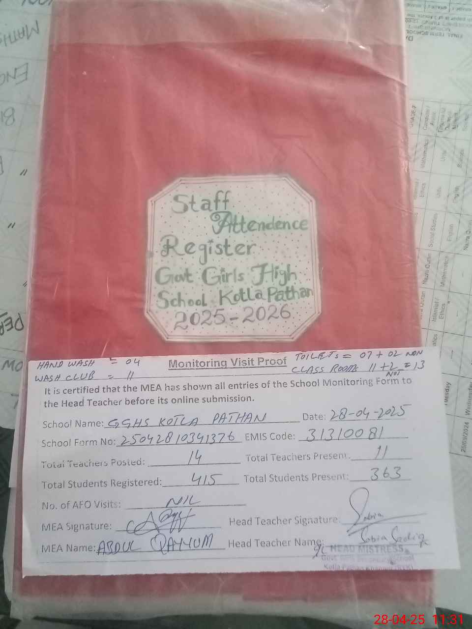 | Attendance Register | Head Teacher | MEA with School | Visit Proof |