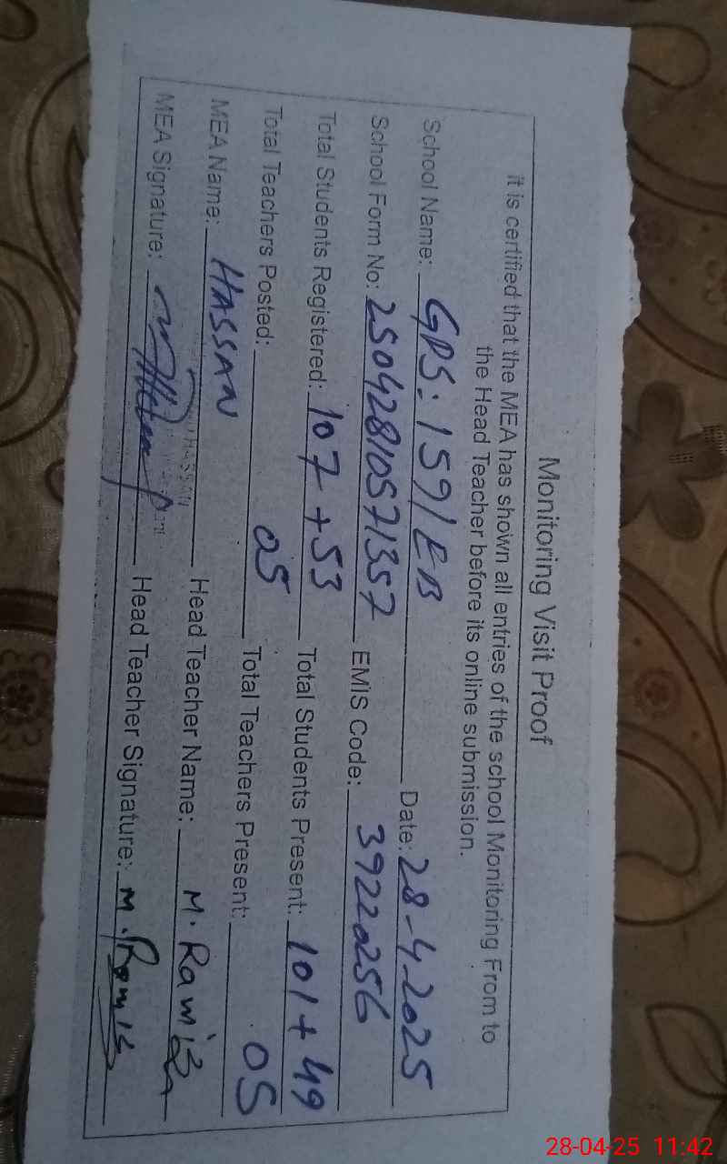 | EMIS Code: 39220256 | Name of School: GPS 159 EB P.O ARIF WALA | |||