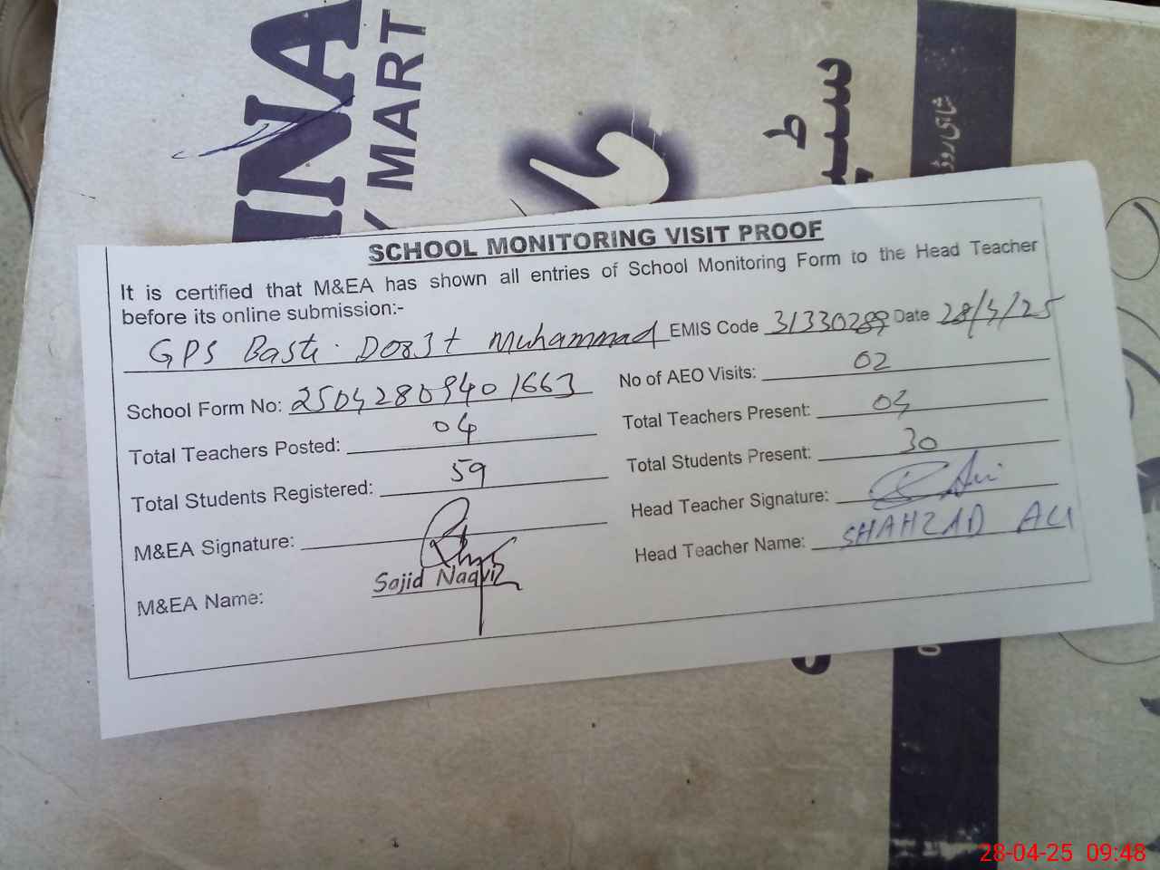 | Attendance Register | Head Teacher | MEA with School | Visit Proof |