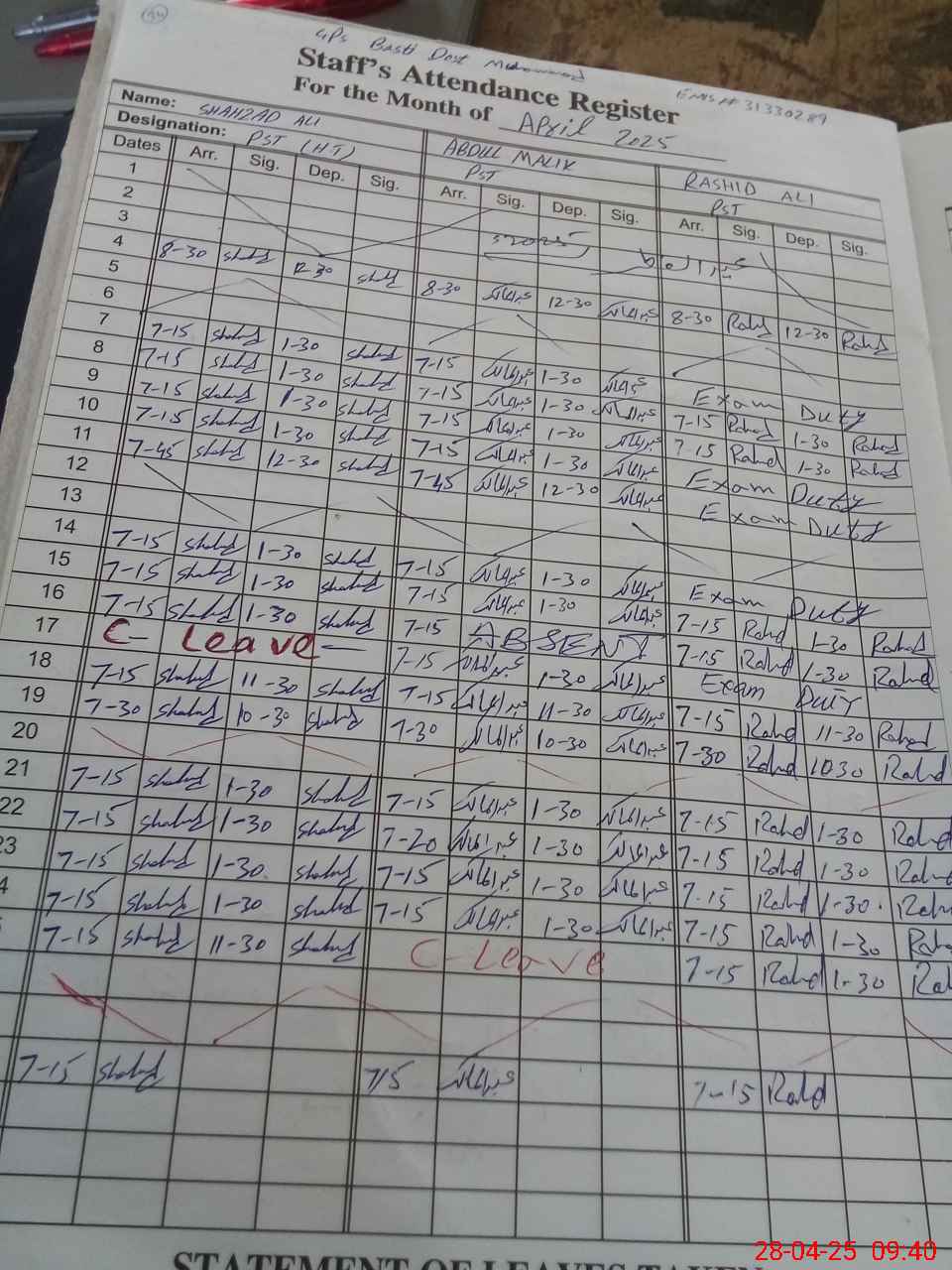 | CNIC | Full Name | Designation | R/C | Absence during last cal. month |