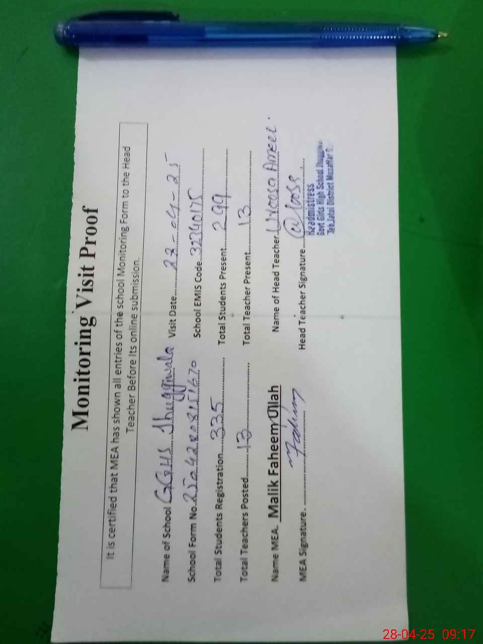 | Attendance Register | Head Teacher | MEA with School | Visit Proof |