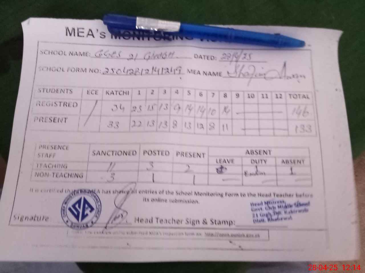 | Attendance Register | Head Teacher | MEA with School | Visit Proof |