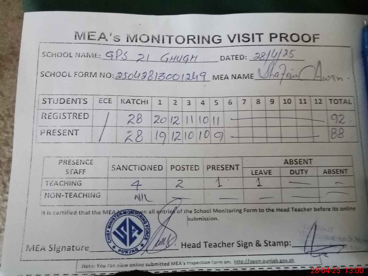 | Attendance Register | Head Teacher | MEA with School | Visit Proof |