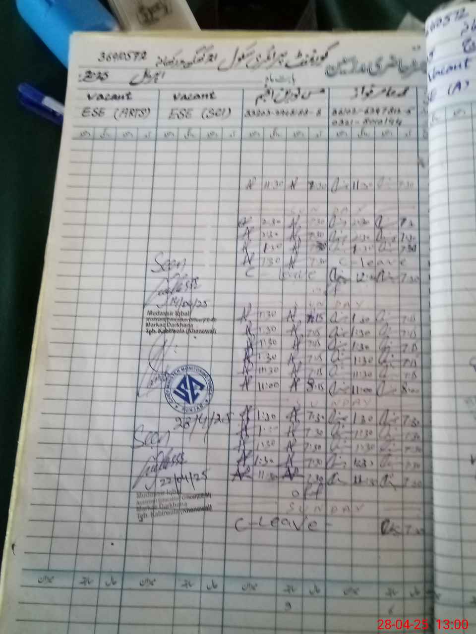 | CNIC | Full Name | Designation | R/C | Absence During Last Calender Month |