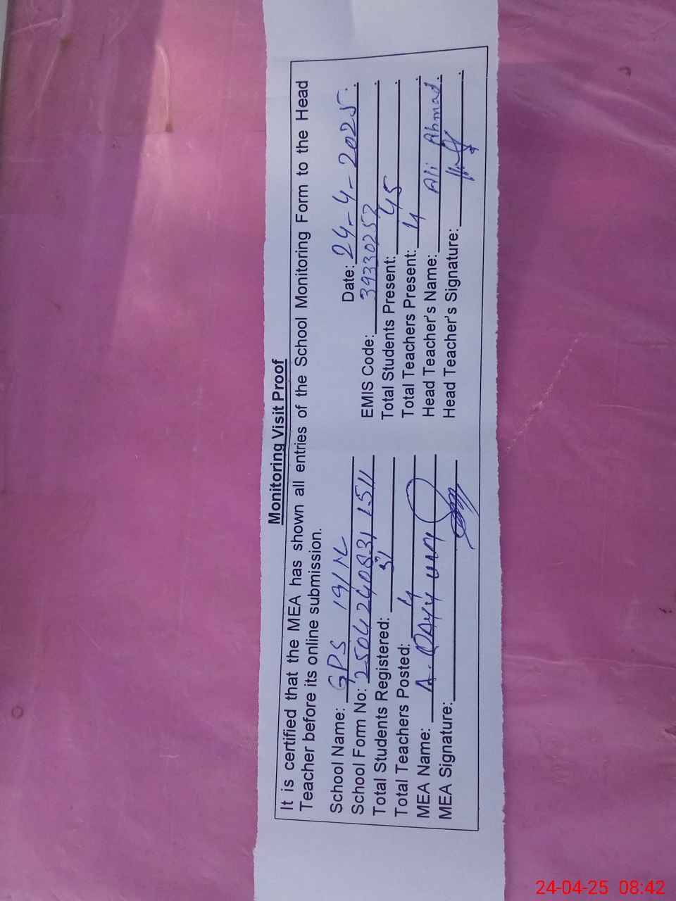 | Attendance Register | Head Teacher | MEA with School | Visit Proof |