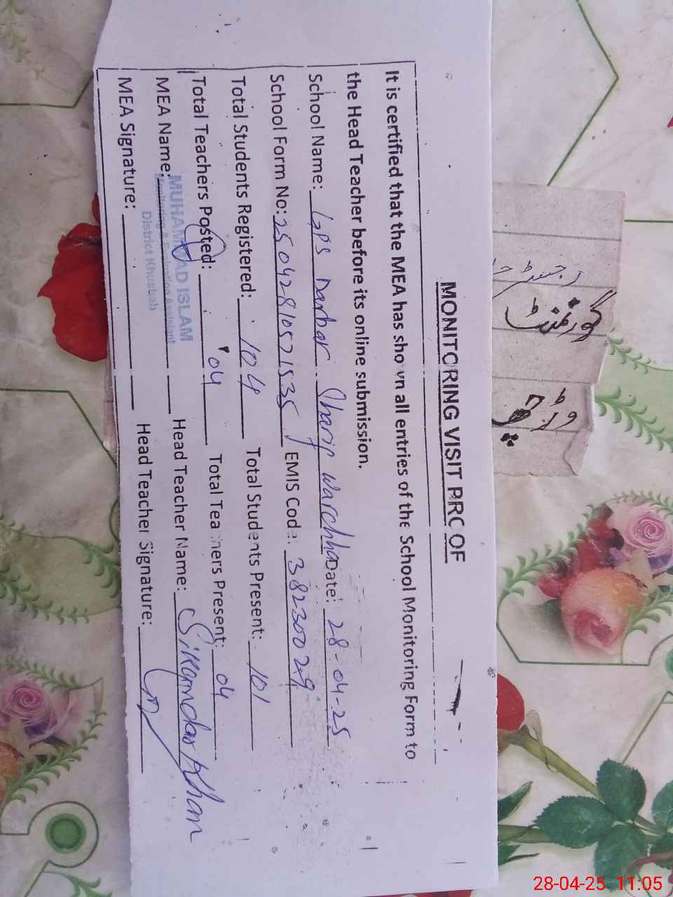 | Attendance Register | Head Teacher | MEA with School | Visit Proof |