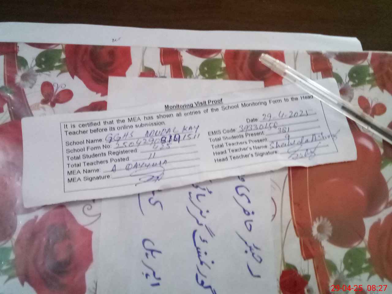 | Attendance Register | Head Teacher | MEA with School | Visit Proof |