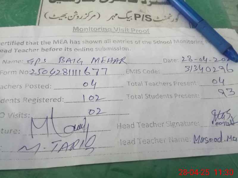 | EMIS Code: 31340296 | Name of School: GPS BAIG MEHAR | |||