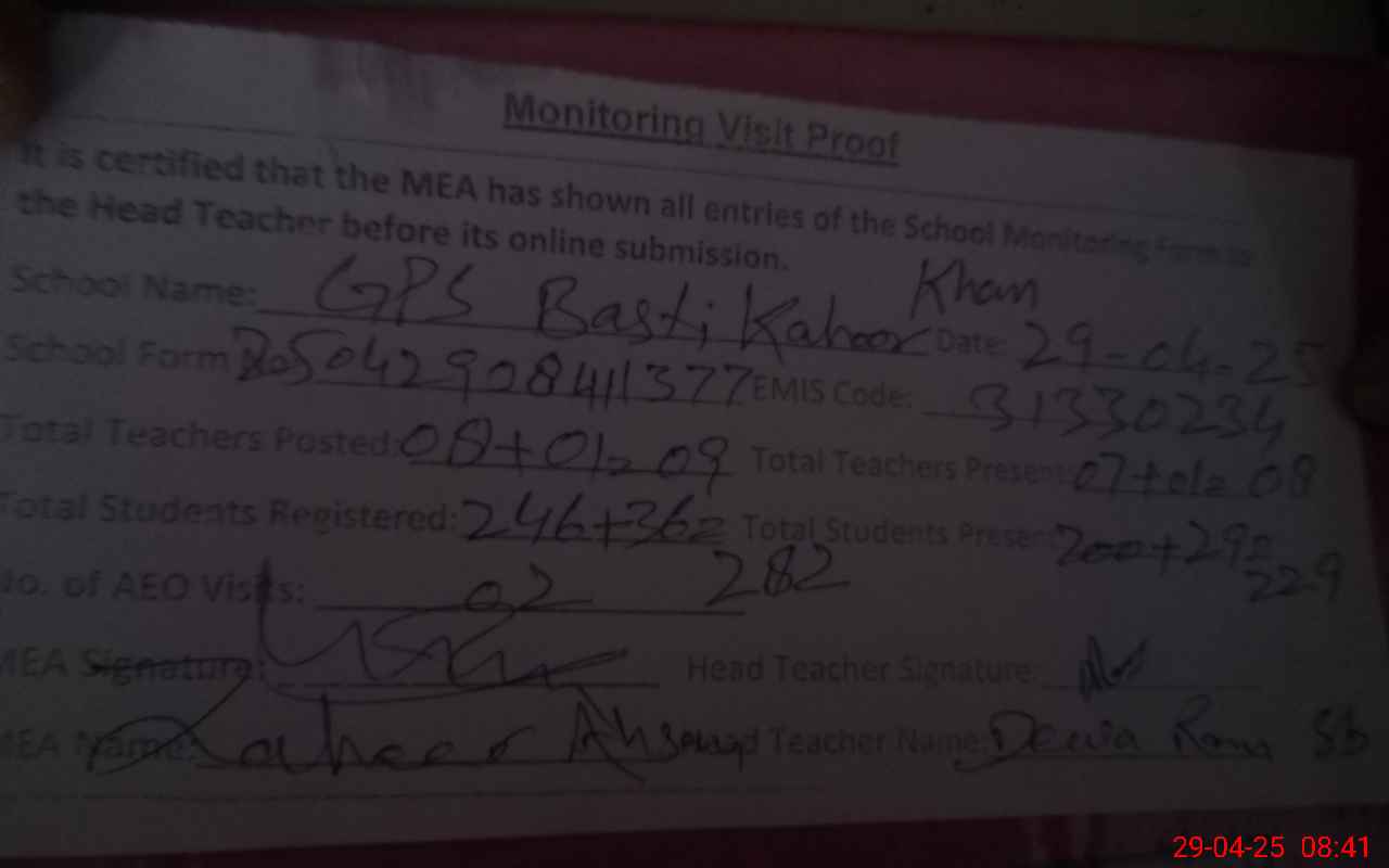 | EMIS Code: 31330234 | Name of School: GPS BASTI KAHOOR KHAN | |||