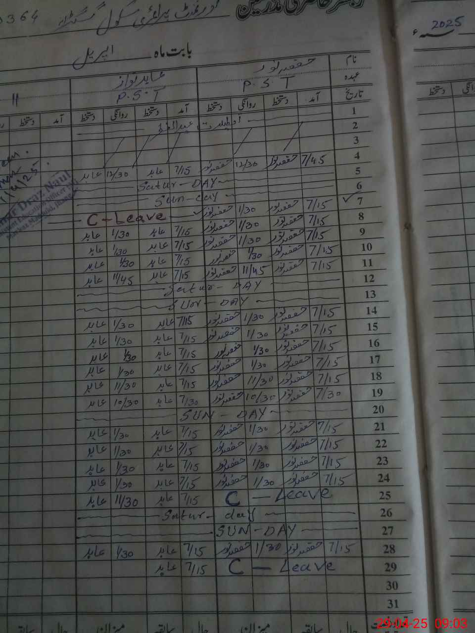 | CNIC | Full Name | Designation | R/C | Absence During Last Calender Month |