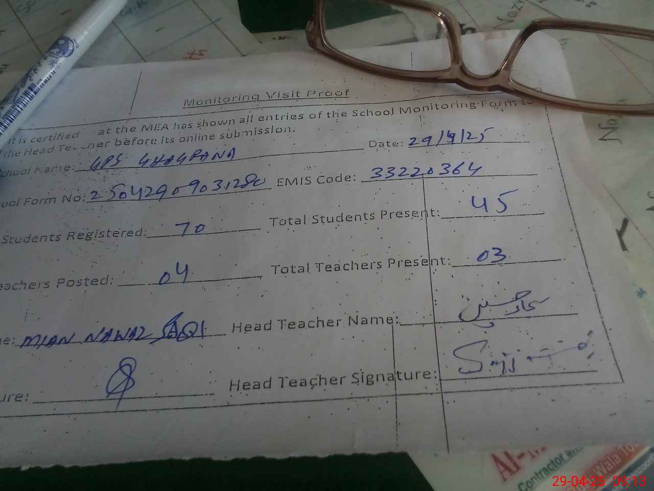 | Attendance Register | Head Teacher | MEA with School | Visit Proof |
