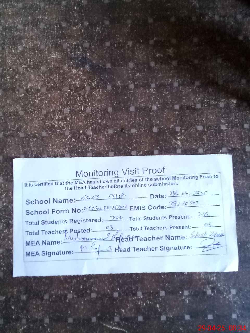 | Certified that this School was Inspected by the Undersigned MEA/DMO Today and the Information Stated Above is as Per Record. | |||||