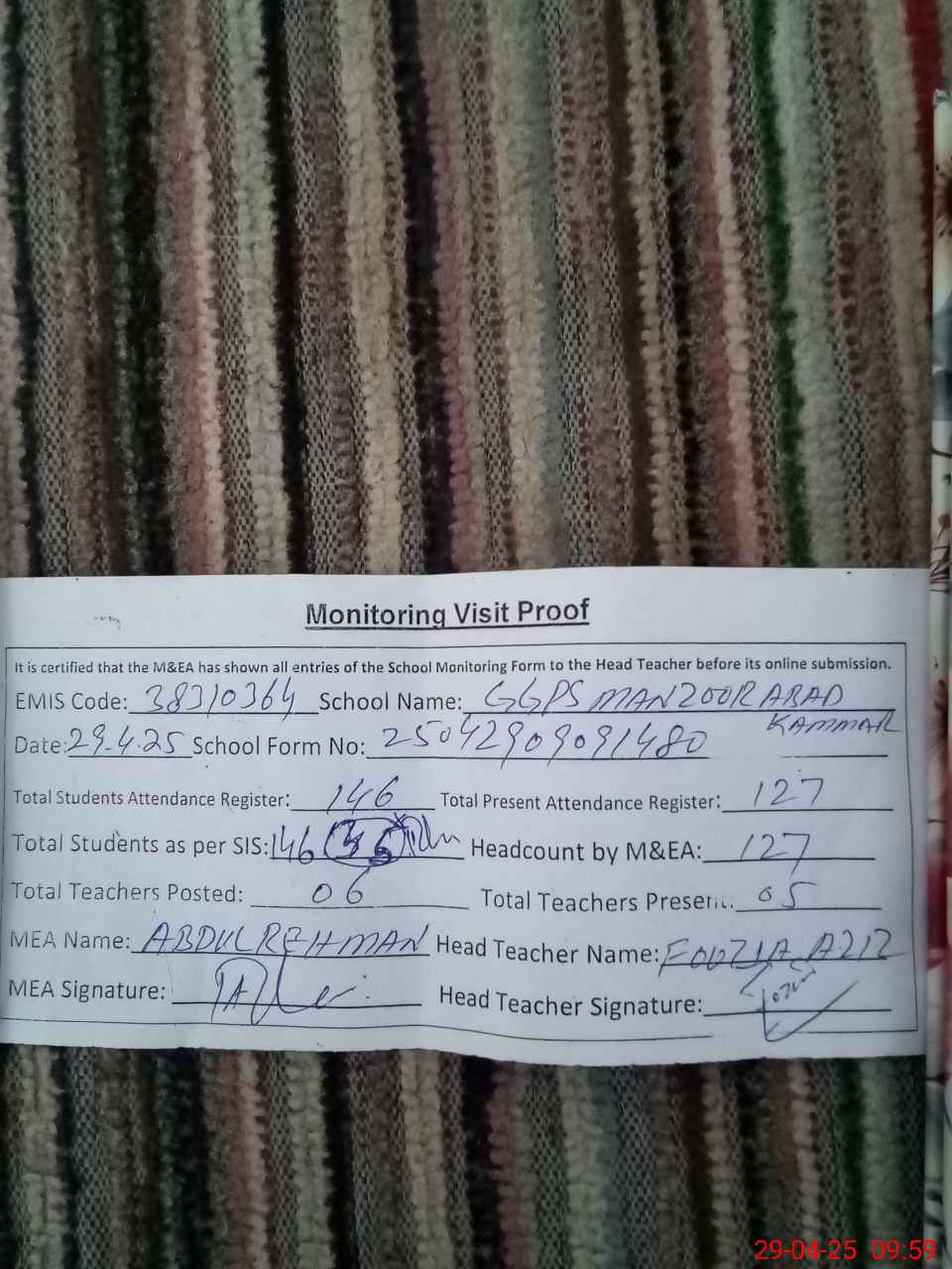 | Attendance Register | Head Teacher | MEA with School | Visit Proof |