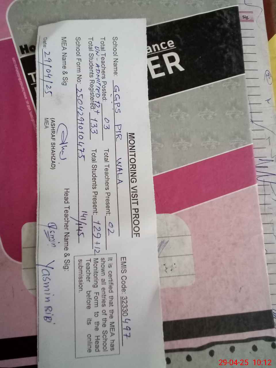 | EMIS Code: 32330497 | Name of School: GGPS PIR WALA | |||