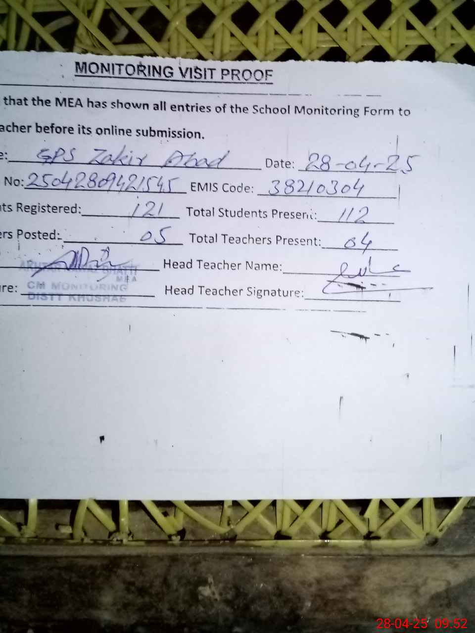 | Attendance Register | Head Teacher | MEA with School | Visit Proof |