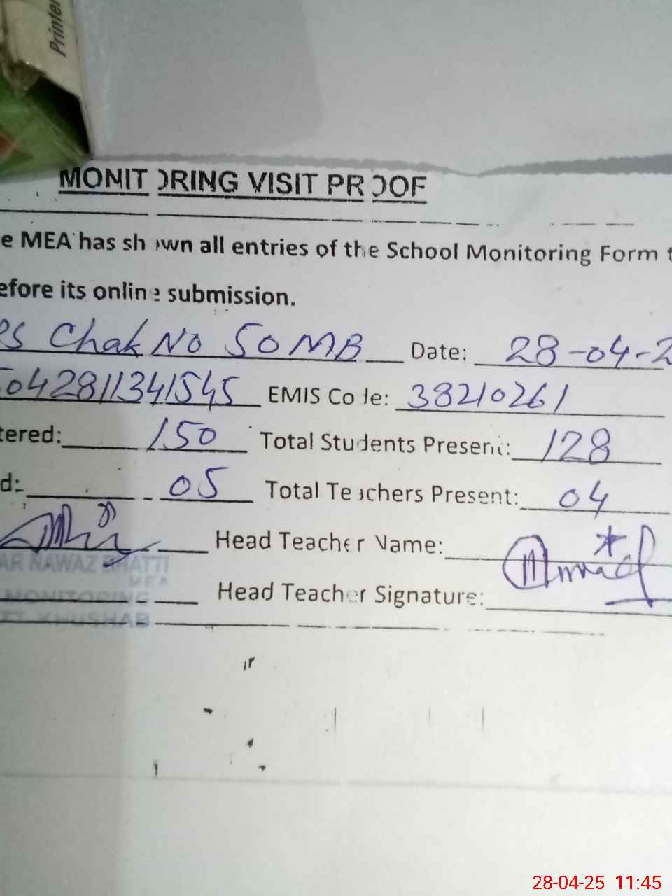 | Attendance Register | Head Teacher | MEA with School | Visit Proof |