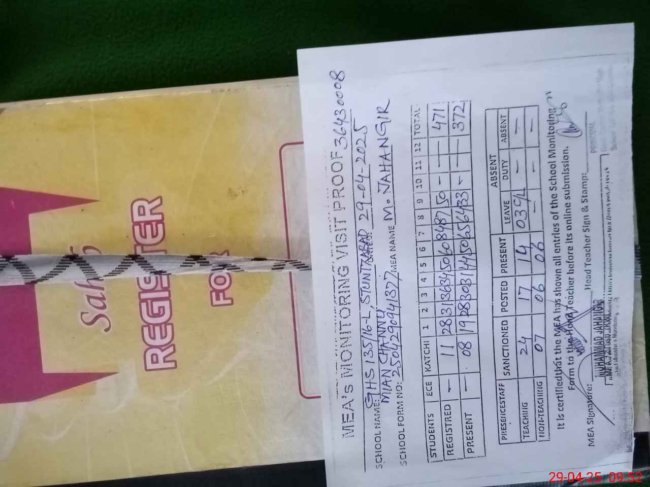 | Attendance Register | Head Teacher | MEA with School | Visit Proof |