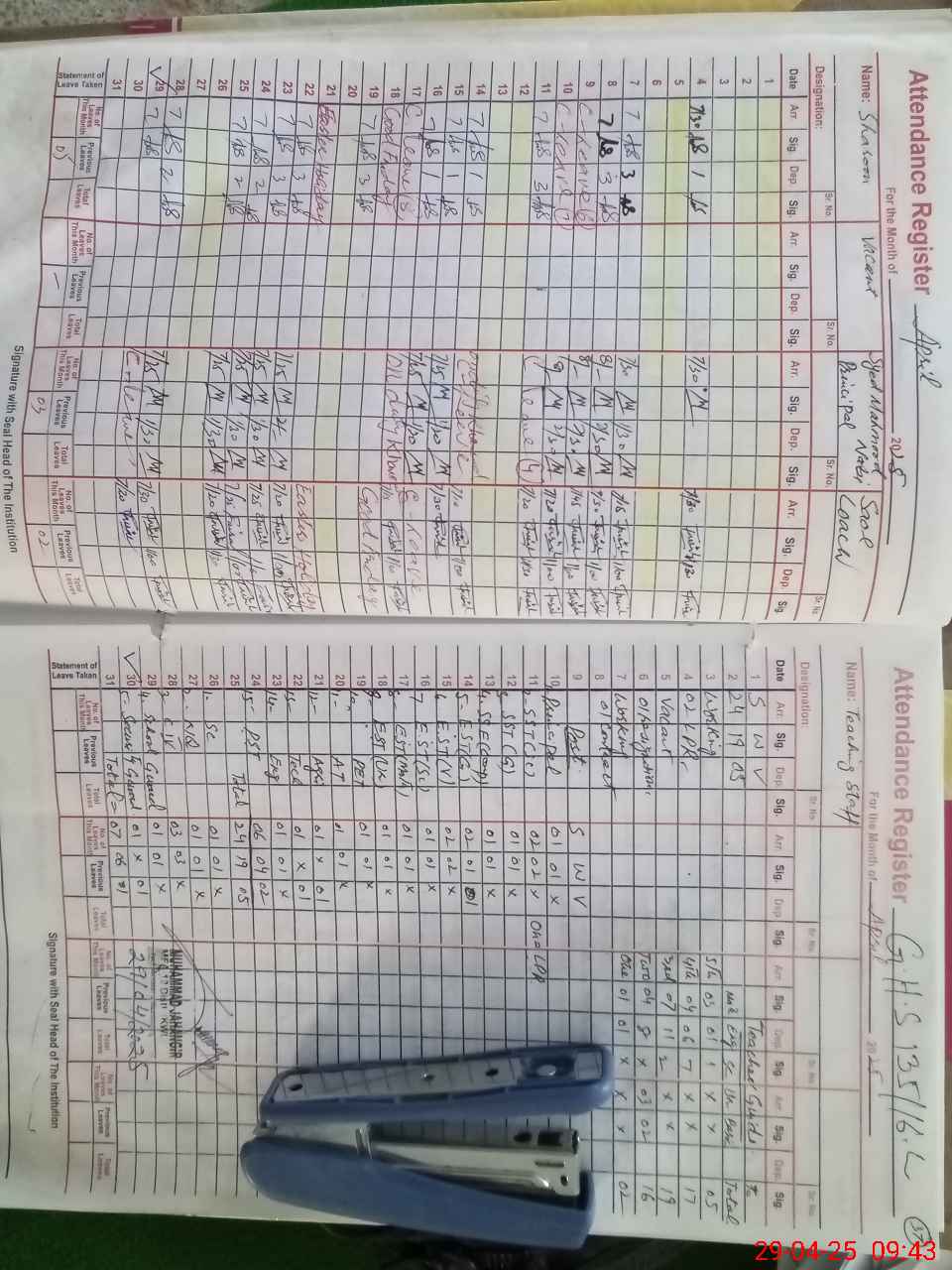 | CNIC | Full Name | Designation | R/C | Absence During Last Calender Month |